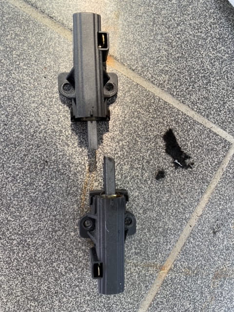concernant le moteur, il y a avait effectivement pas mal de poussière noire, j'ai tout nettoyé et en ai profité pour faire une photo des balais. ne sachant quelle taille cela fait neuf, je ne sais pas s'il sont à changer (j'ai pris une photo si jamais ça vous permet de me le dire).