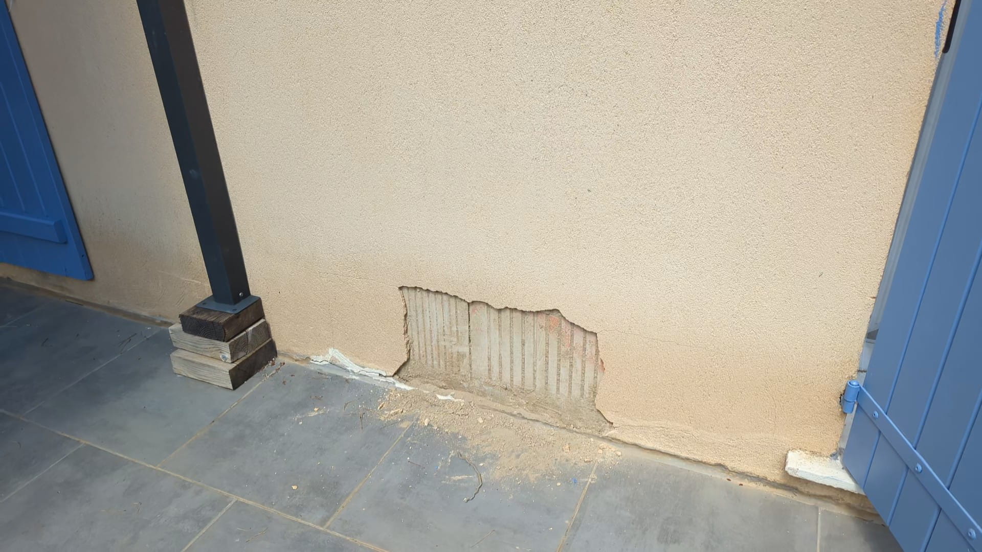 Je veux mettre sur une moitier de façade de la maison du bas sur une hauteur de 45cm ou 60cm. Sur cette partie il y a une terrasse en carrelage adossée à la maison maison la dale de la terrasse ne fait pas partie de la dale de la maison.