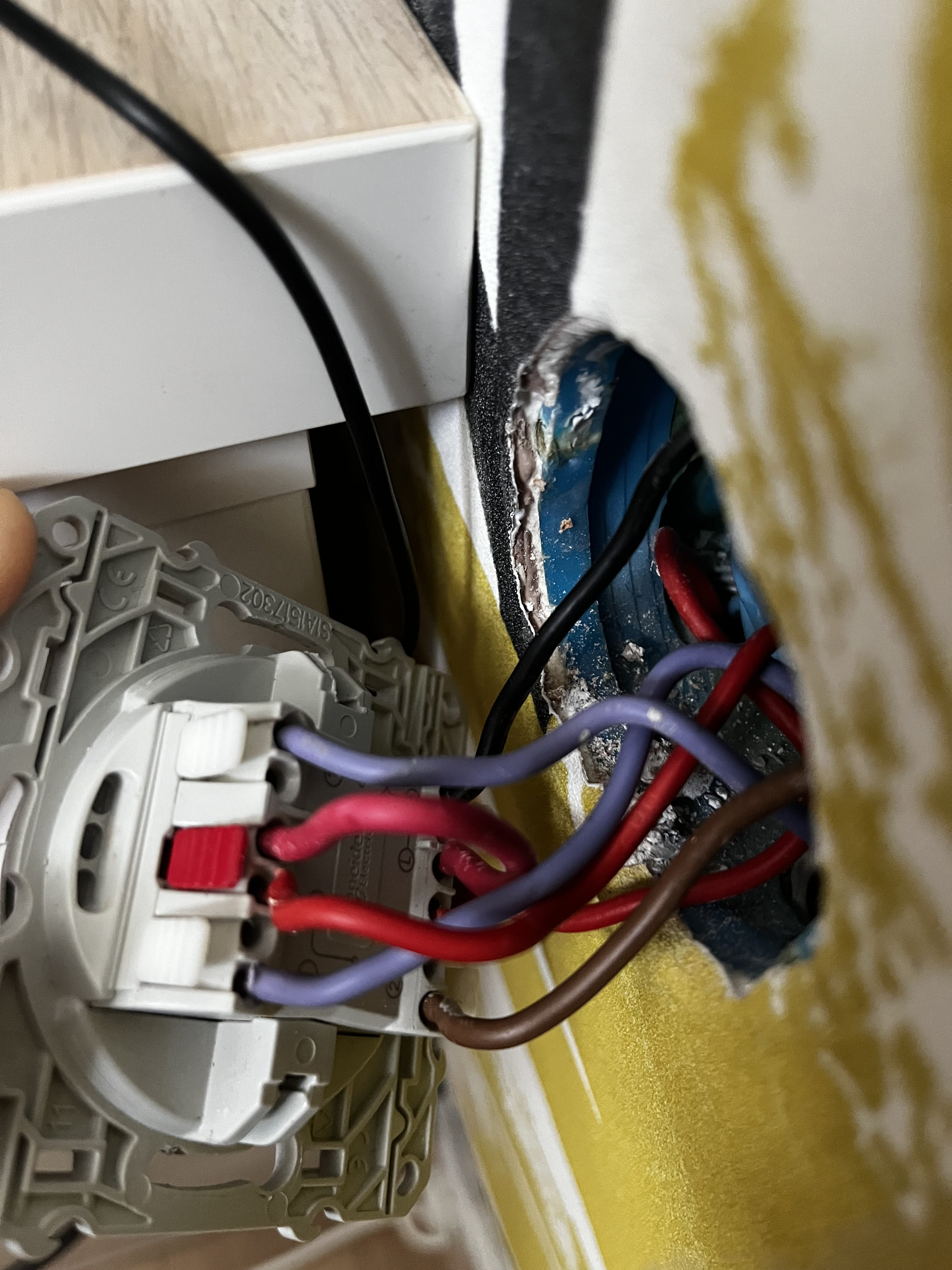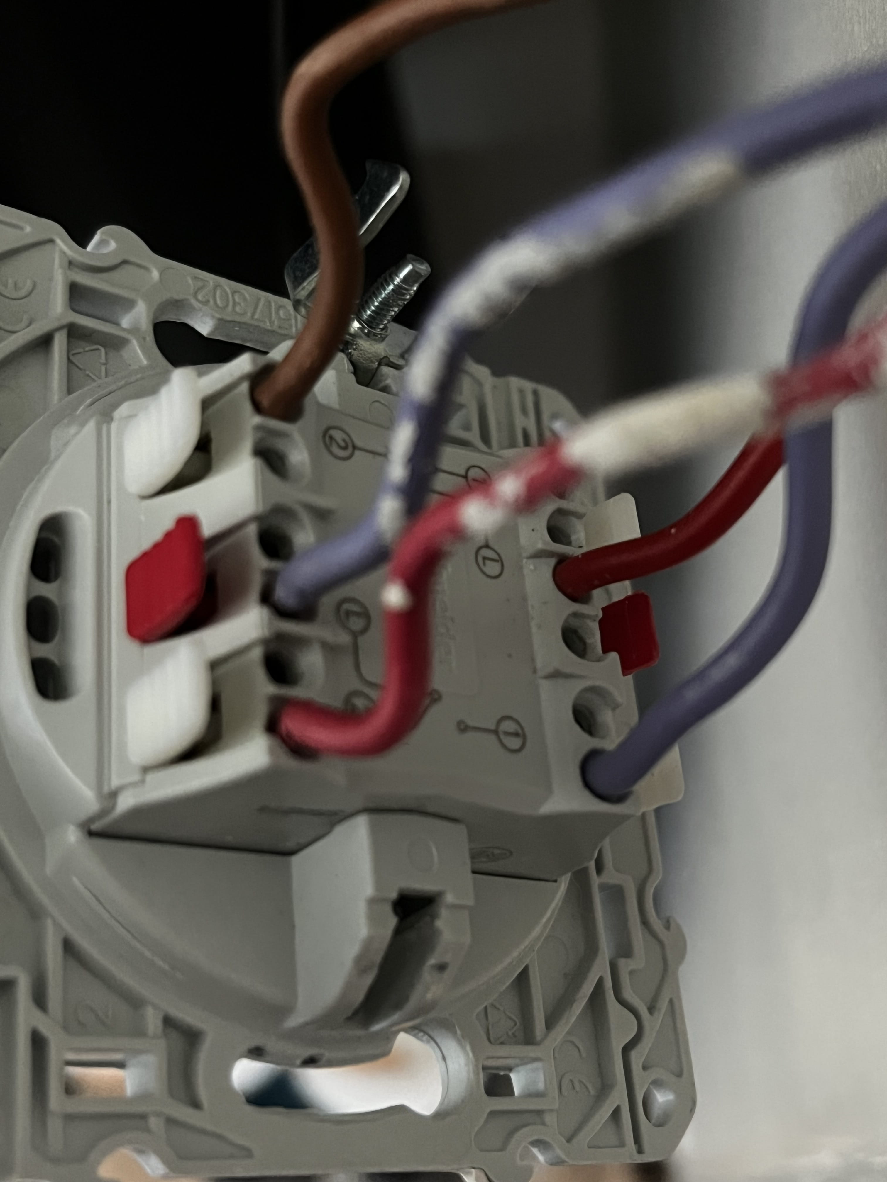Posez votre questionMerci de votre aide j’ai réussi à résoudre le problème ses bien les violets sur borne 1 et 2 de chaque interrupteur les rouges sur le L le marron du premier double interrupteur pour allumer le spot du dressing sur le 1 et l’autre double interrupteur même procédé à part le maron du plafonnier sur le L pour le retour lampe pour éteindre et allumer d’un interrupteur à l’autre ????