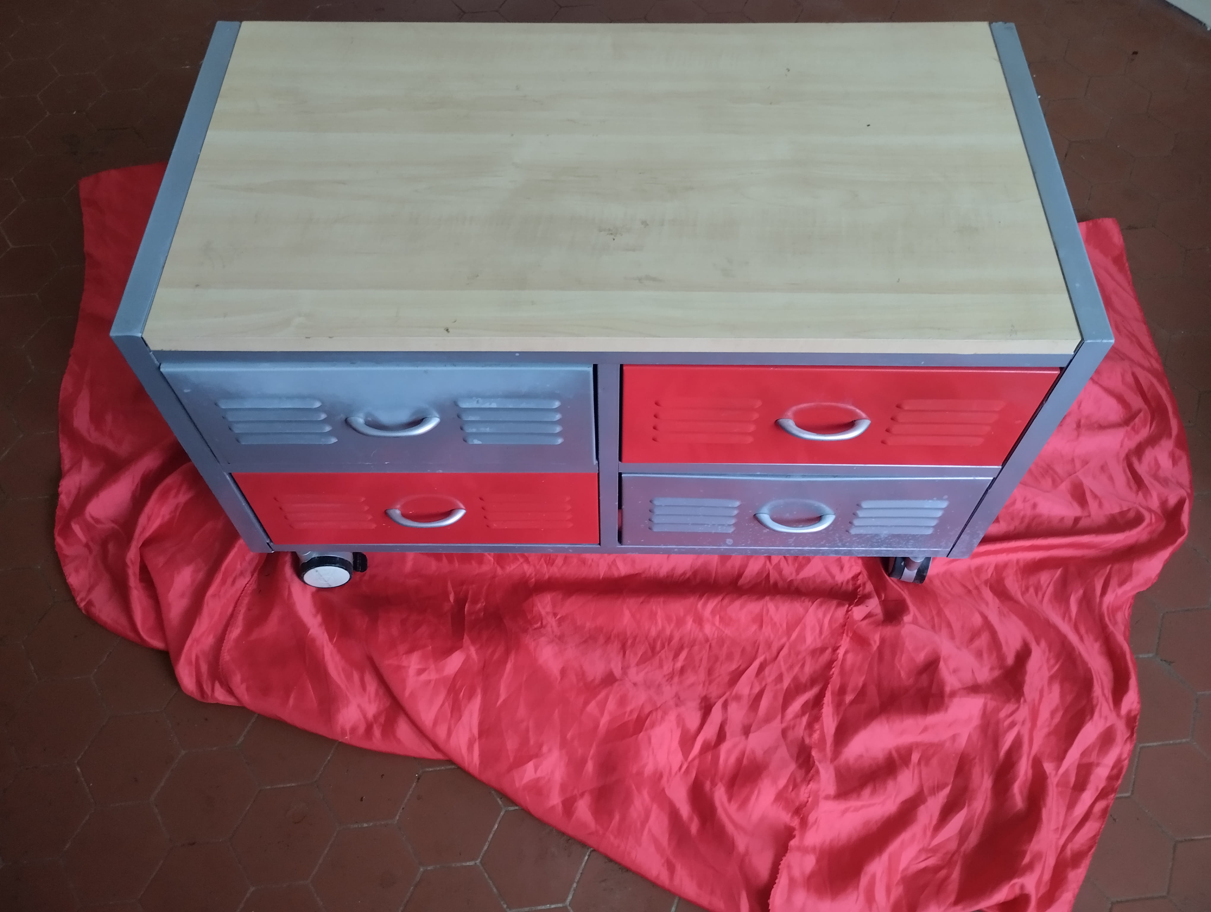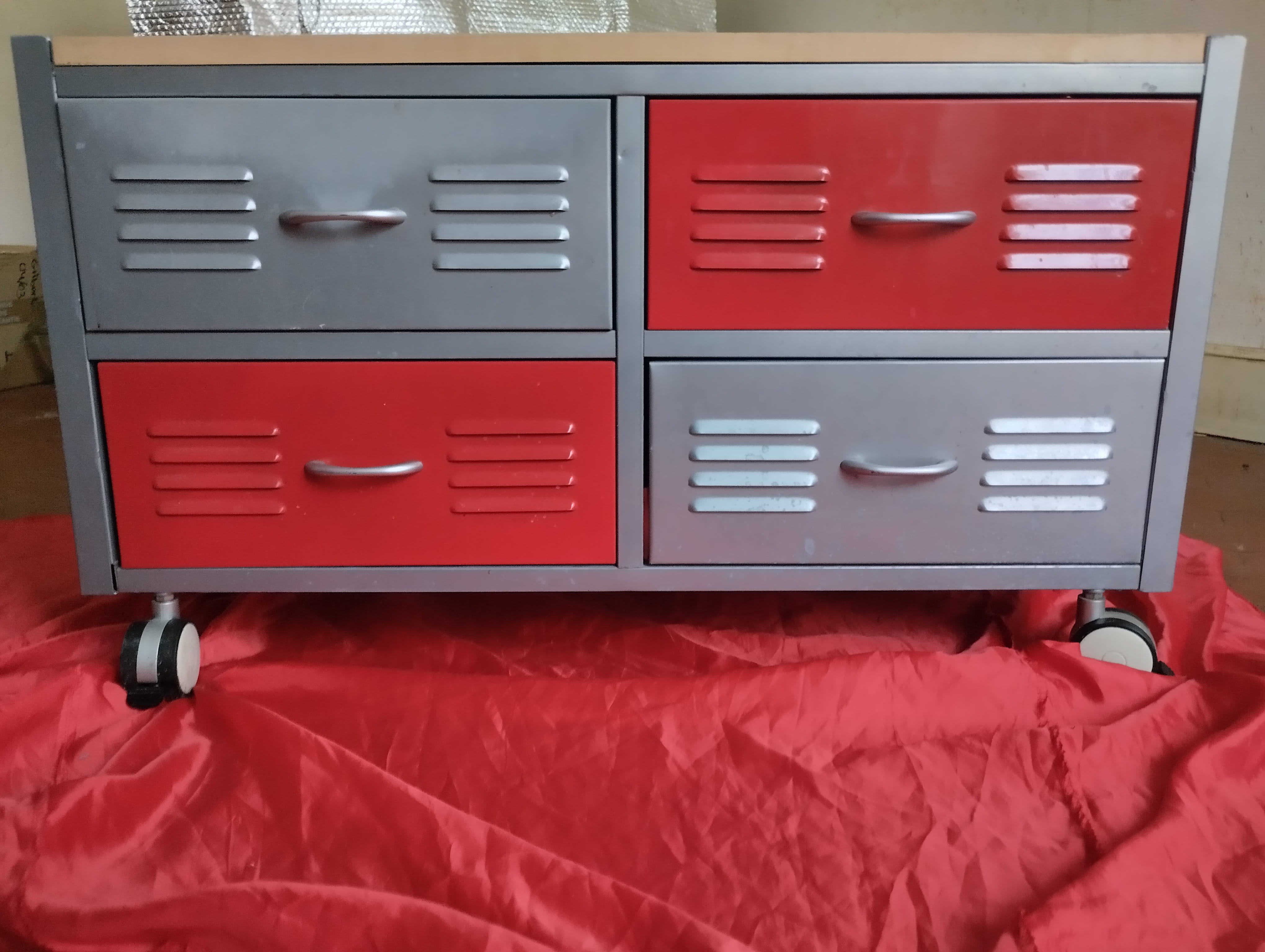 Comme vous voyez, le rouge est correct, les parties grises défraîchies. (En fait, on ne voit pas bien sur les photos, mais les tiroirs gris ont des tâches blanches, surtout celui de droite).