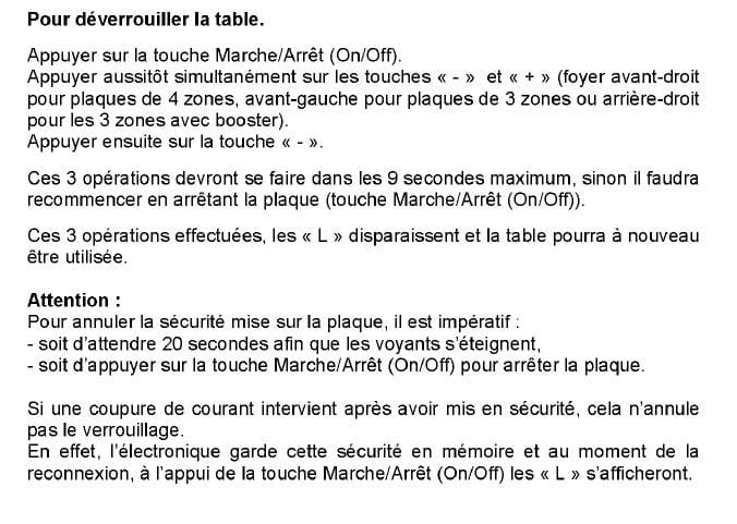 Votre plaque est en sécurité enfants Pour valider son déverrouillage il faut la référence de cette plaque, au pire lire ce qui suit. Ou lire votre notice.