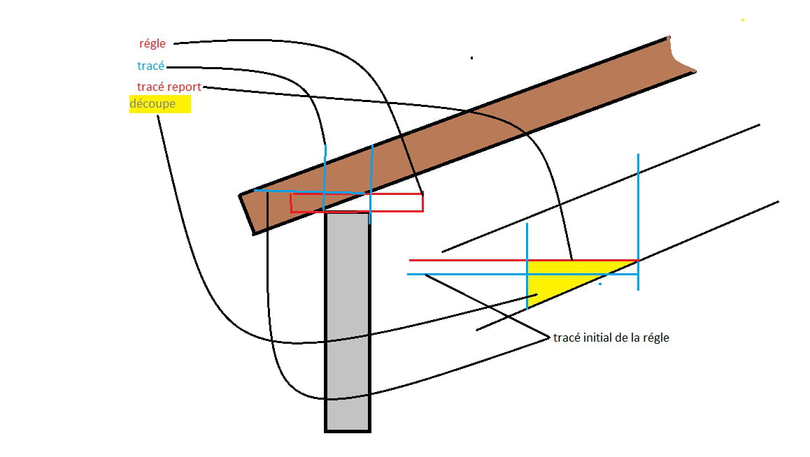 je suis entrain de restaurer une charpente de grange avec pignon central, pour le faîtage pas de soucis pour fixer les chevrons , mais à l'autre extrémité ils sont fixés sur une sablière posée à plat et en biais, j'ai tout essayé même avec une fausse équerre je n'arrive pas à trouver l'angle de coupe et faire le trçage sur le chevron pour la découpe, y a t-il une astuce pour trouver le bon angle ? car depuis je suis bloqué.