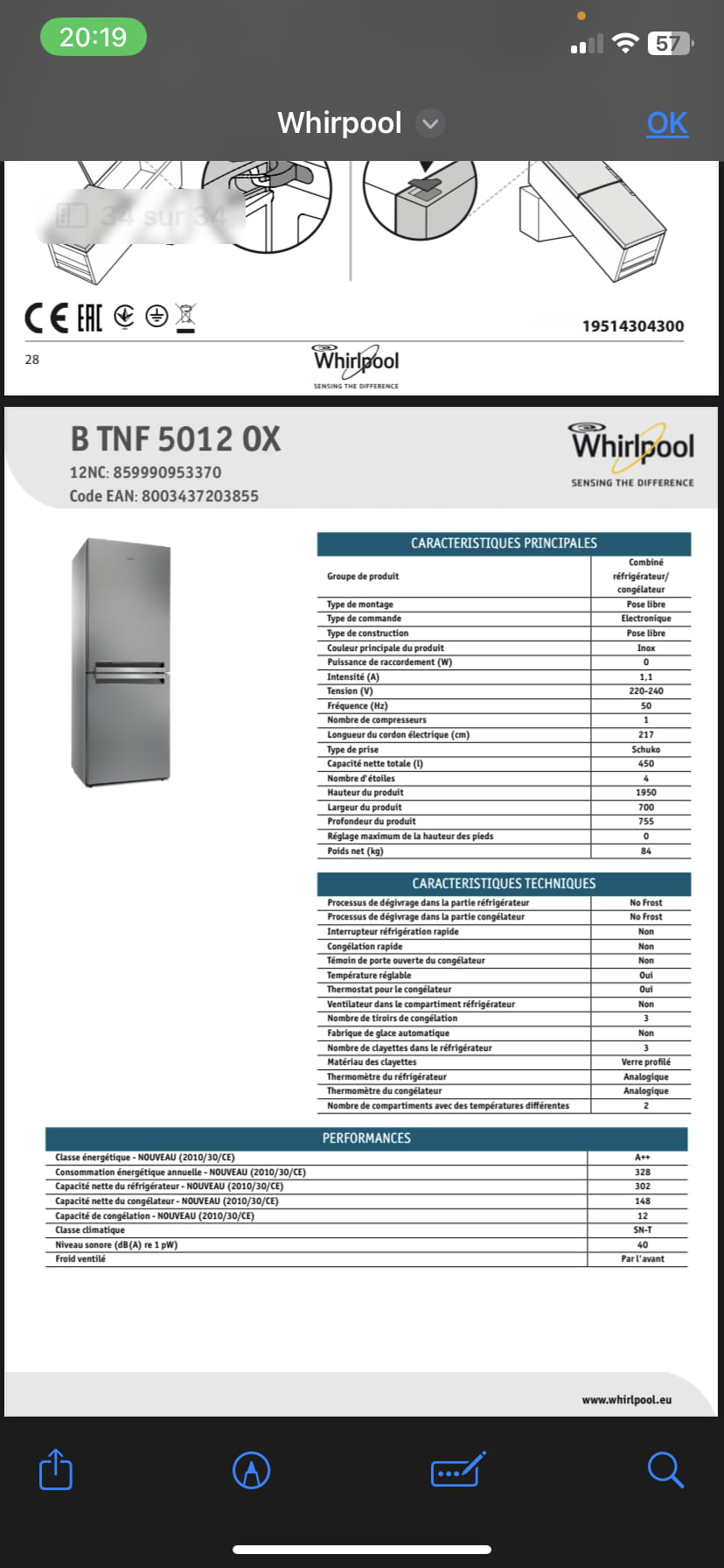 j’ai acheté un combiné réfrigérateur congélateur Whirpool 6e sens no front BTNF 5012 OX