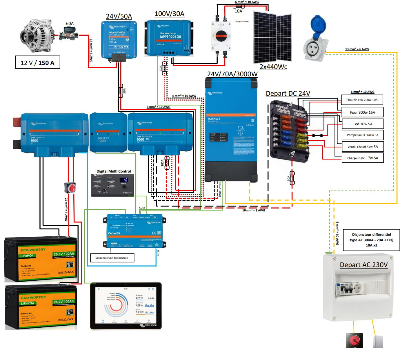 Ils vont voyager à deux dans ce véhicule pendant des mois et souhaiteraient être le plus autonomes possible. J'ai donc choisi un réseau en 24 V (car pour moi plus sécurisé sur plusieurs points) avec un onduleur de 3000w. Comme moyen de recharge, 50A de l'alternateur + 30A de solaire si ensoleillement au top + 70A de l'onduleur sur une prise réseau camping. Avec comme stockage, 2 batteries LiFePO₄ de 24v 100Ah en parallèle. Je me suis concentré sur la gamme Victron qui me semble bien réputée et très variée !