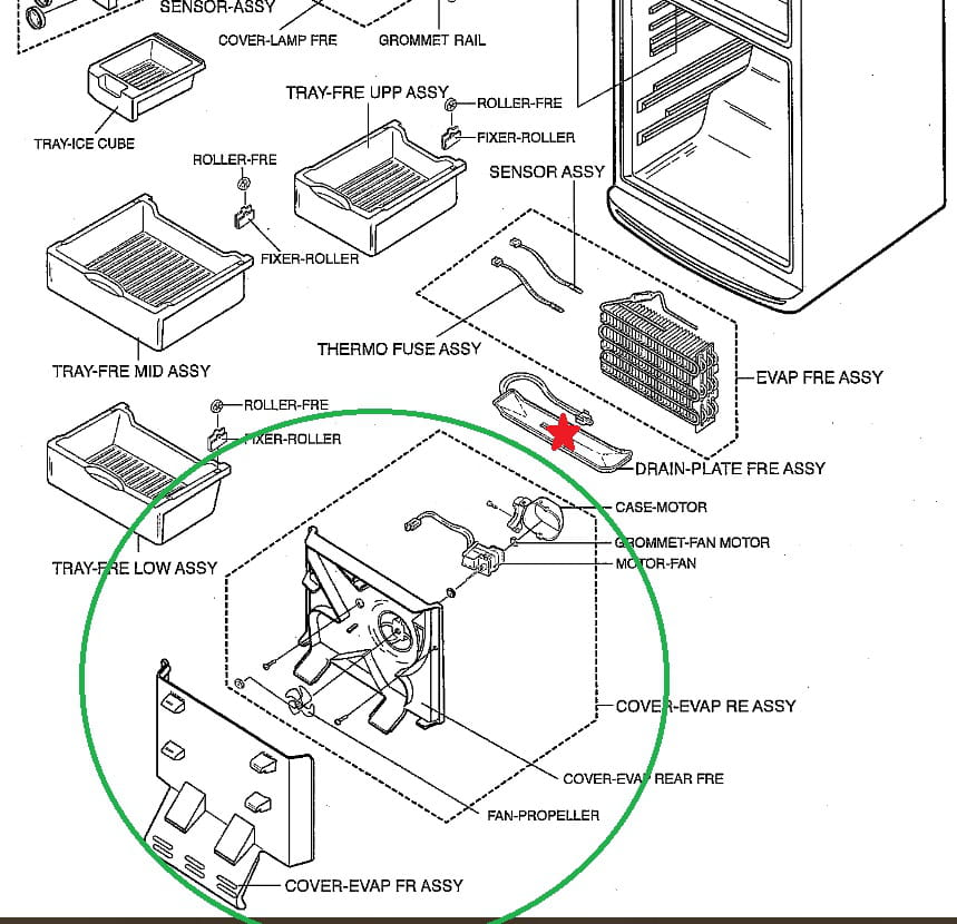 Pour le voir il faudrait enlever les carters "rond vert" et vérifier qu'il n'y a pas de glace sous l'étoile qui est l'évacuation d'eau.