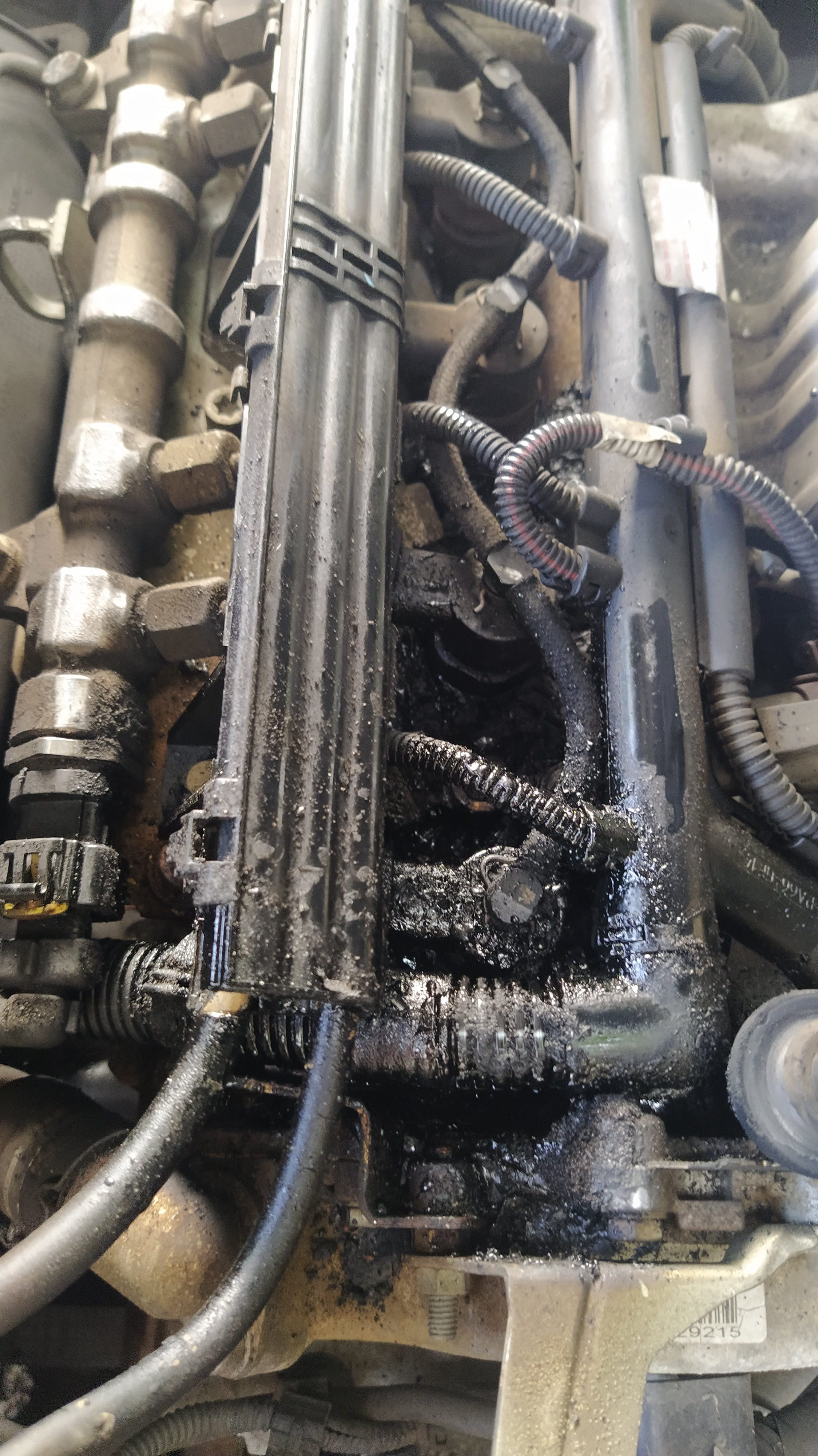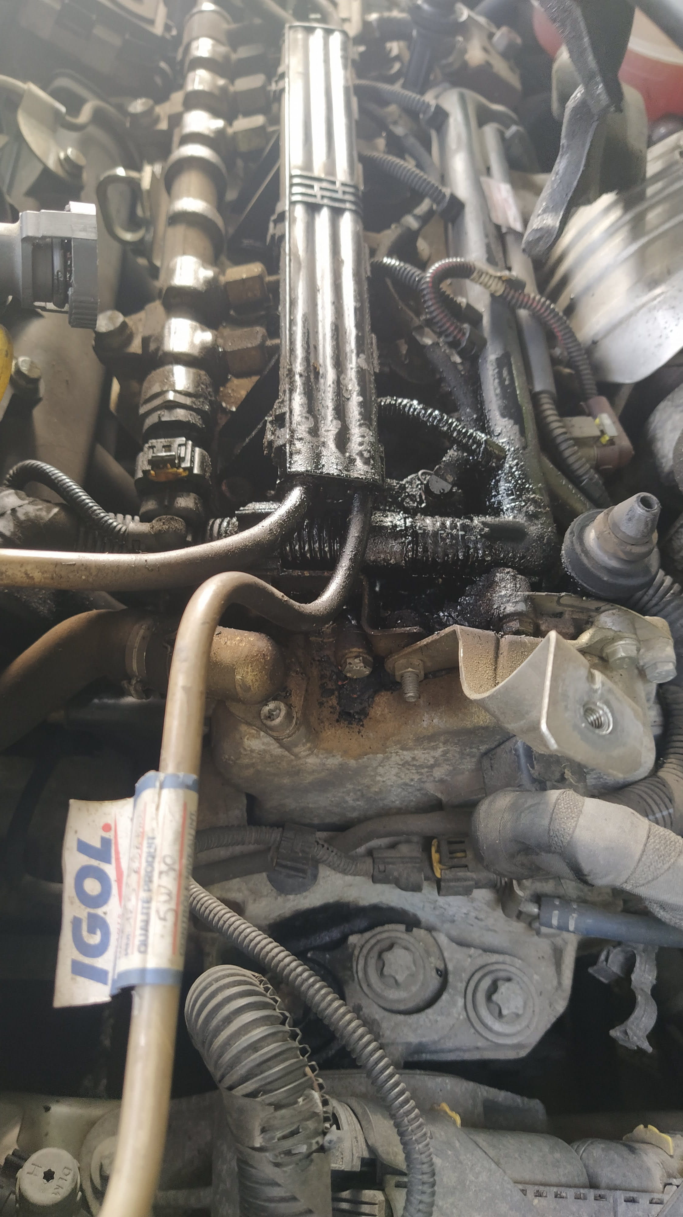 J'ai essayé de voir où la fuite pouvait être, mais je n'en ai aucune idée.... Il y a du carbone brûlé comme on peut voir sur la photo, mais je ne sais pas si c'est dû à une fuite d'huile ou une fuite d'essence. Il n'y a aucune fuite sur les 2 tuyaux d'essence.
