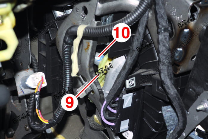 Je n'ai plus de chauffage dans le Kangoo. Pour l'hiver c'est pas pratique. Je me suis muni d'un schéma que j'ai acheté sur internet. J'ai pu repérais où la pièce est située. Sur le cliché, il s'agit de la pièce à droite du 9 un peu plus bas (câbles clair-violets et noirs). Il faudrait dégrafer une majeur partie du tableau